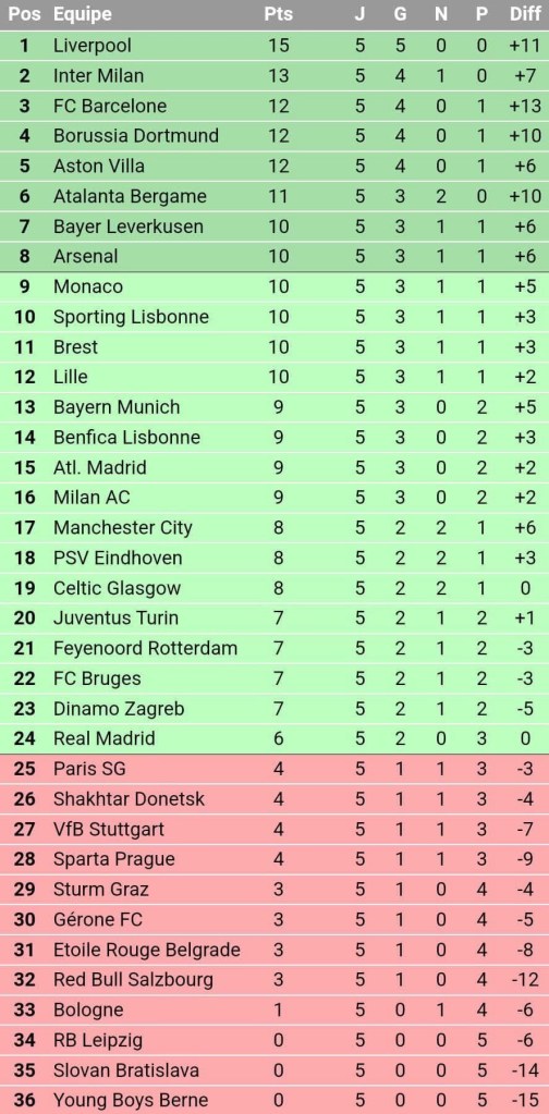 🔴 Le CLASSEMENT de la Ligue des Champions après les matchs de mercredi : Liverpool est 1er, le REAL est 24eme, PSG 25eme !