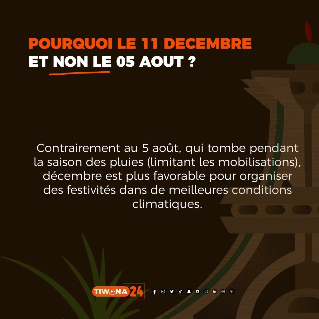 Le 11 décembre est devenu un moment fort pour rassembler les citoyens autour des valeurs d’indépendance, Contrairement au 5 août, qui tombe pendant la saison des pluies (limitant les mobilisations), décembre est plus favorable pour organiser des festivités dans de meilleures conditions climatiques.