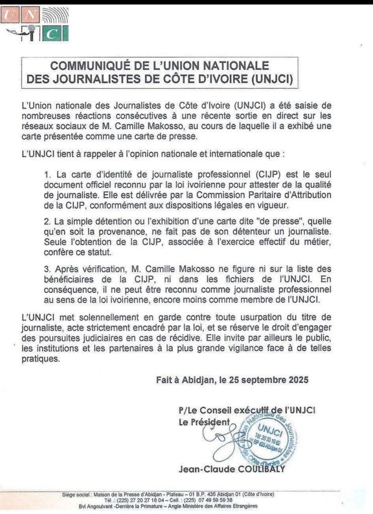 Camille Makosso vient encore de faire ce quâil sait le mieux : du bruit. Mais cette fois, son vacarme vise directement le mĂ©tier de journaliste. ArmĂ© dâune prĂ©tendue « carte internationale », il sâĂ©rige en donneur de leçons face Ă lâUnion nationale des journalistes de CĂŽte dâIvoire (UNJCI). RĂ©sultat ? Une nouvelle provocation, doublĂ©e dâun profond manque de respect.