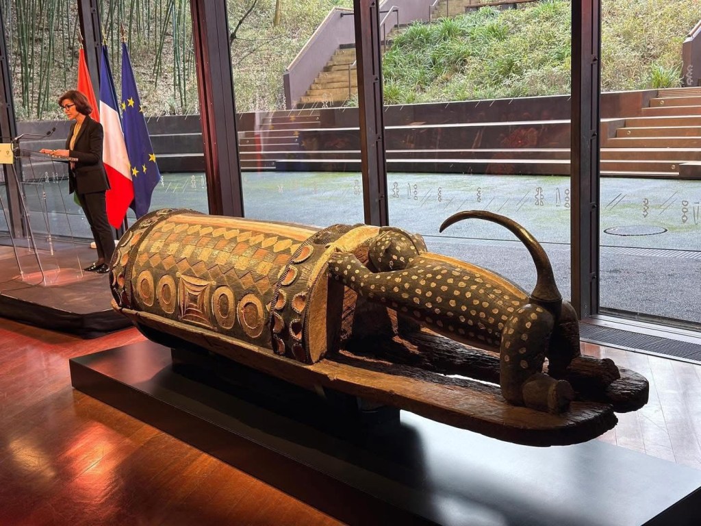 ConservĂ© pendant plus dâun siĂšcle au MusĂ©e du quai Branly â Jacques Chirac Ă Paris, le Djidji AyokwĂȘ avait Ă©tĂ© saisi en 1916 durant la pĂ©riode coloniale.